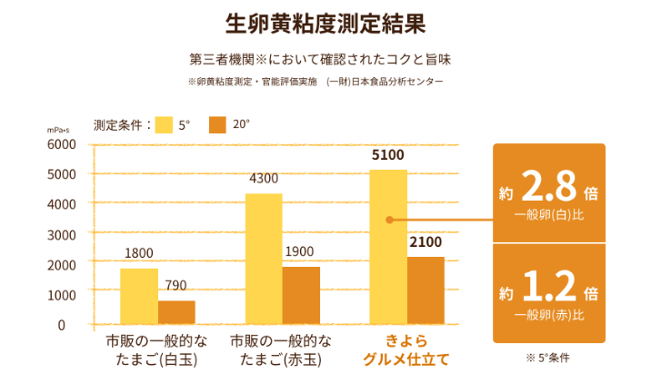 第三者機関の「生卵黄粘度測定結果」によると、