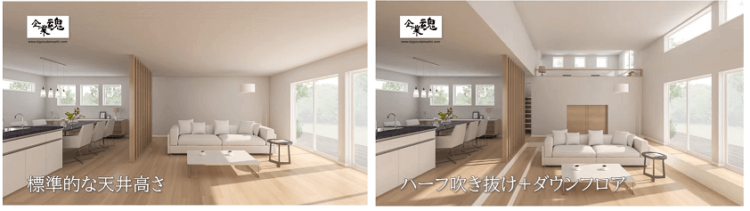 写真左が一般的なリビング、そして写真右がスキップフロアです。