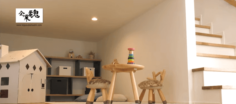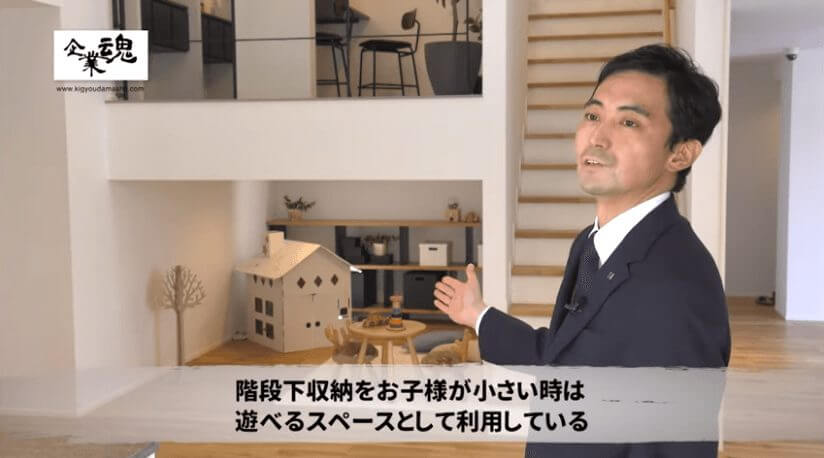 階段下に収納スペースを作り、子供が小さいうちは遊べるスペースに、
